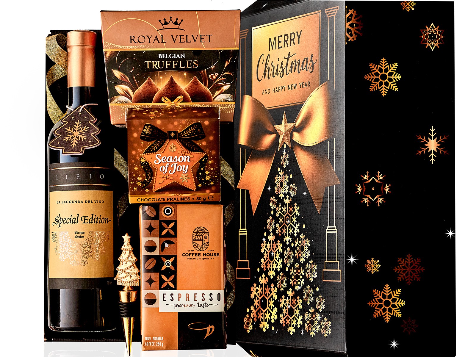 Vin rosu demisec Lirio Special Edition 750 ml Cafea Coffee House Espresso Sicilia Style 250 g Trufe Belgiene de ciocolata Belgian Truffles 150 g Decoratiune lemn Craciun Dop festiv pentru vidat sticla de vin Praline Delice Chocolate editia de Craciun 50 g Cutie cadou eleganta cu design de Craciun Filler pentru decor. Cutie suplimentara pentru protectie si transport