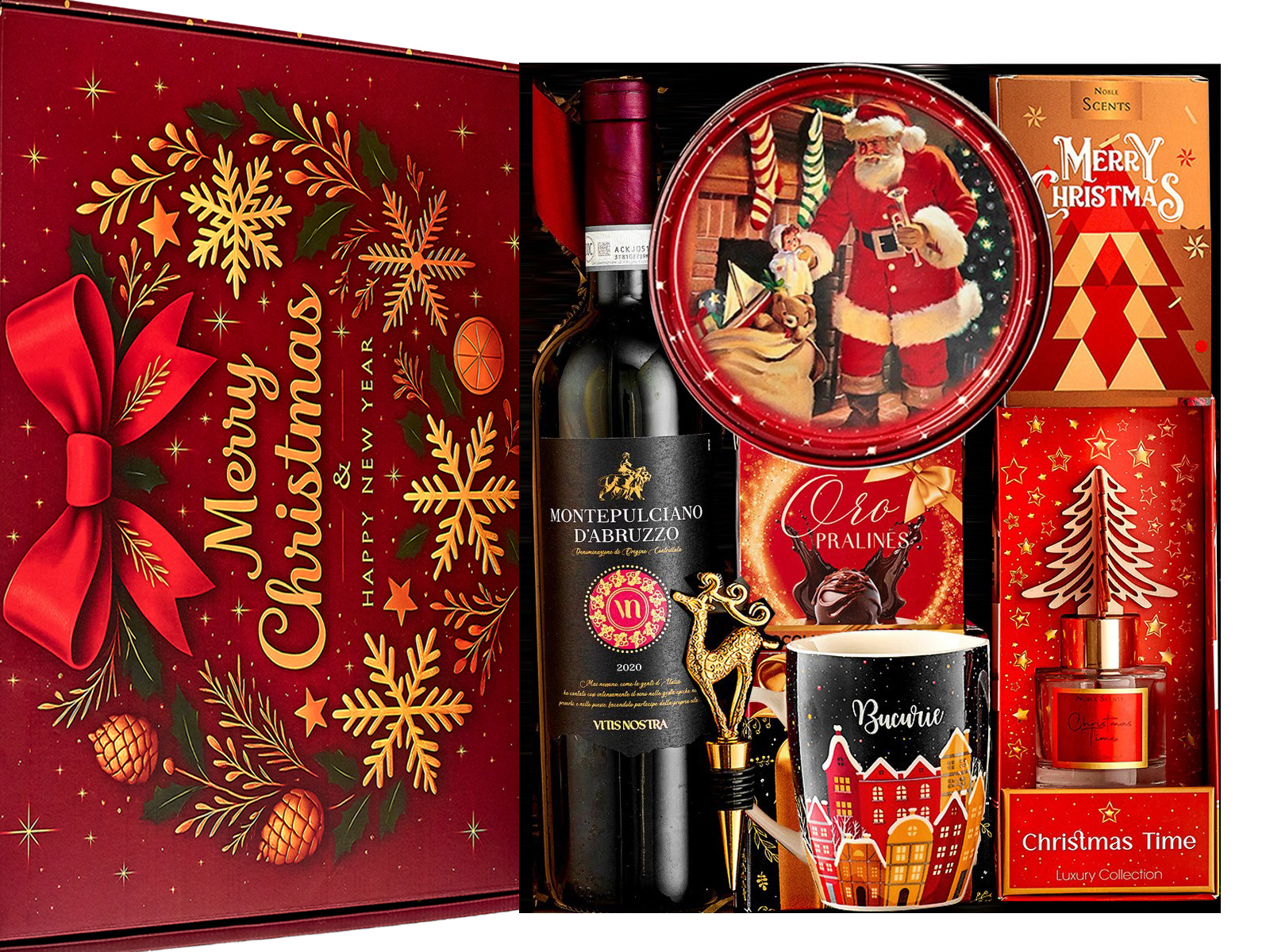 Vin rosu Montepulciano D’Abruzzo 750ml Cana eleganta pentru ceai si cafea in cutie festiva Praline Delice Chocolate 50 g Christmas Time Diffuser parfum de camera cu model Bradut, in cutie cadou Dop festiv pentru vidat sticla de vin Fursecuri daneze cu unt Santa Collection in cutie metalica 150 g Lumanari parfumate Noble Scents Merry Christmas Cutie cadou cu design de Craciun Filler pentru decor. Cutie suplimentara pentru protectie si transport