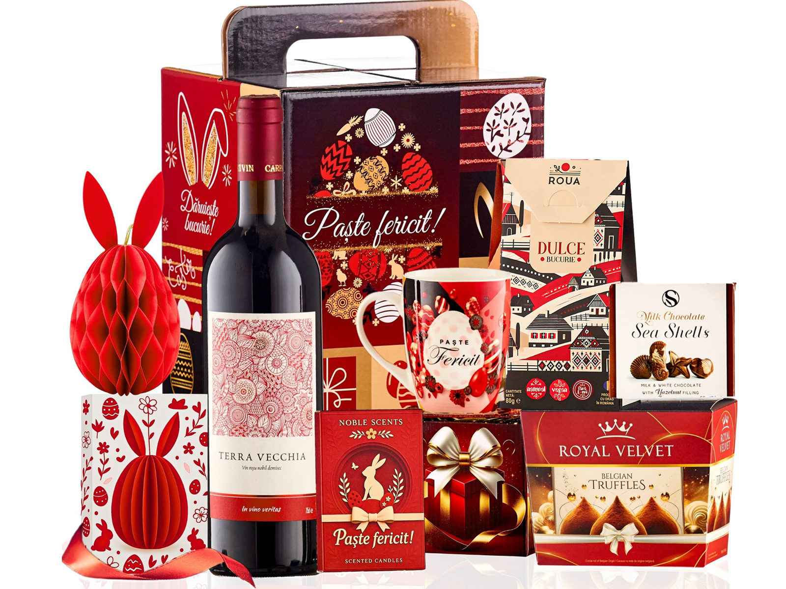 Vin rosu demisec Terra Vecchia 750 ml Cana eleganta pentru ceai si cafea in cutie festiva cu design de Paste Roua delicii dulci cu mirodenii si cacao 80 g Praline ciocolata Seashells 60 g Royal Velvet trufe de ciocolată fina 150g Set lumanari parfumate Paste Fericit Decoratiune de hartie Iepuras de Paste Cutie cadou cu maner cu design festiv Cutie suplimentara pentru protectie si transport