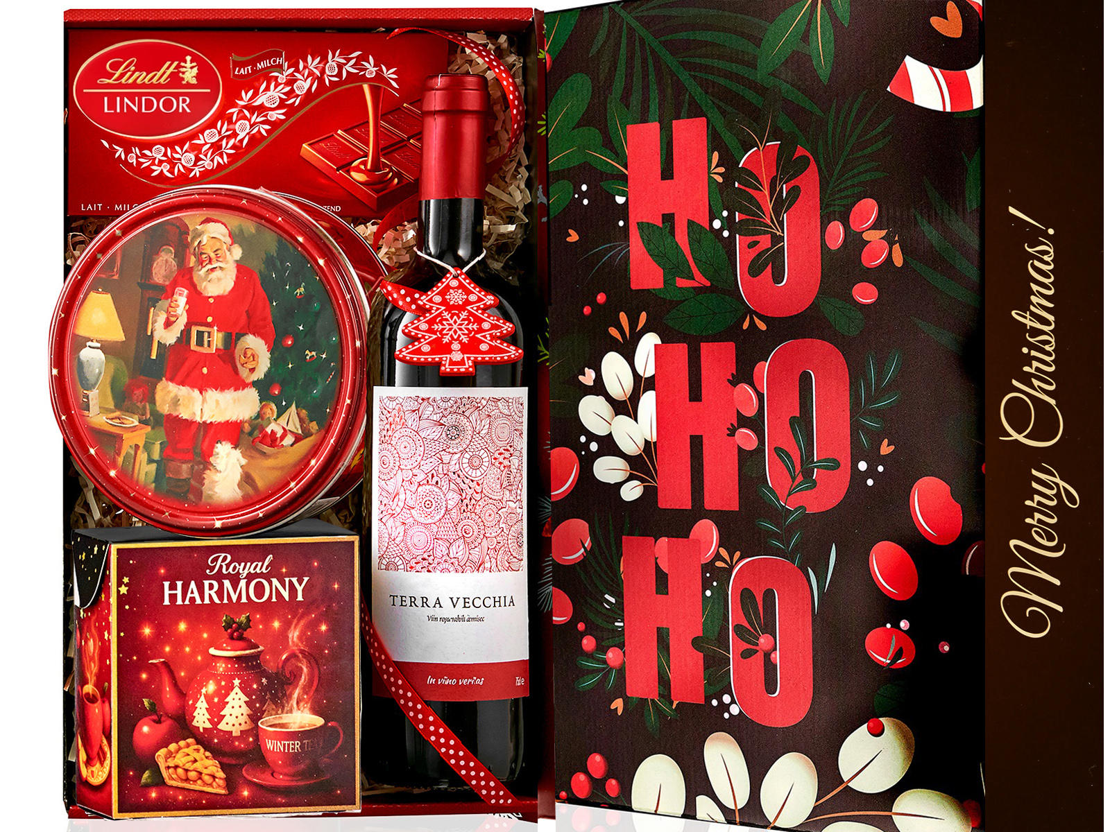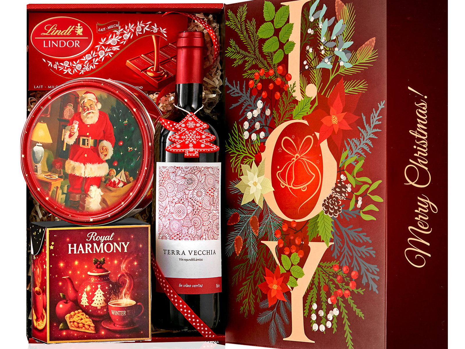 Vin rosu demisec Terra Vecchia 750 ml Ornament Bradut de lemn Fursecuri daneze cu unt Santa Collection in cutie metalica 150 g Lindor Lindt ciocolata cu lapte, 100 g Cutie cadou cu model de Craciun Royal Harmony Christmas Celebration Tea 32.4 g Filler pentru decor. Cutie suplimentara pentru protectie si transport
