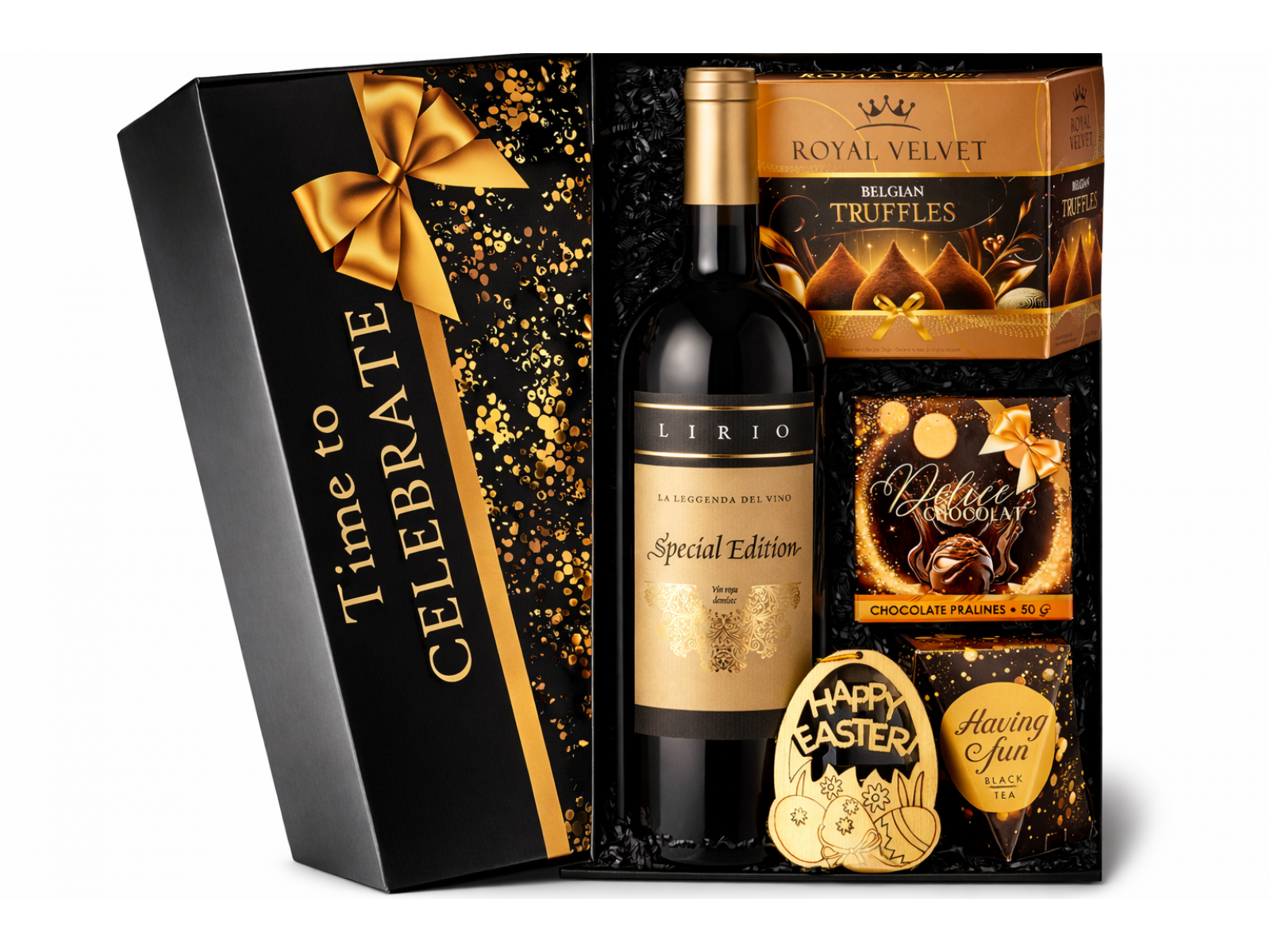 Vin rosu demisec Lirio Special Edition 750 ml Royal Velvet trufe belgiene de ciocolata fina 150 g Oro Delices Praline de ciocolata Black tea Having Fun ceai Decoratiune de Paste Happy Easter din lemn Cutie cadou cu model elegant Filler pentru decor Cutie suplimentara pentru protectie si transport