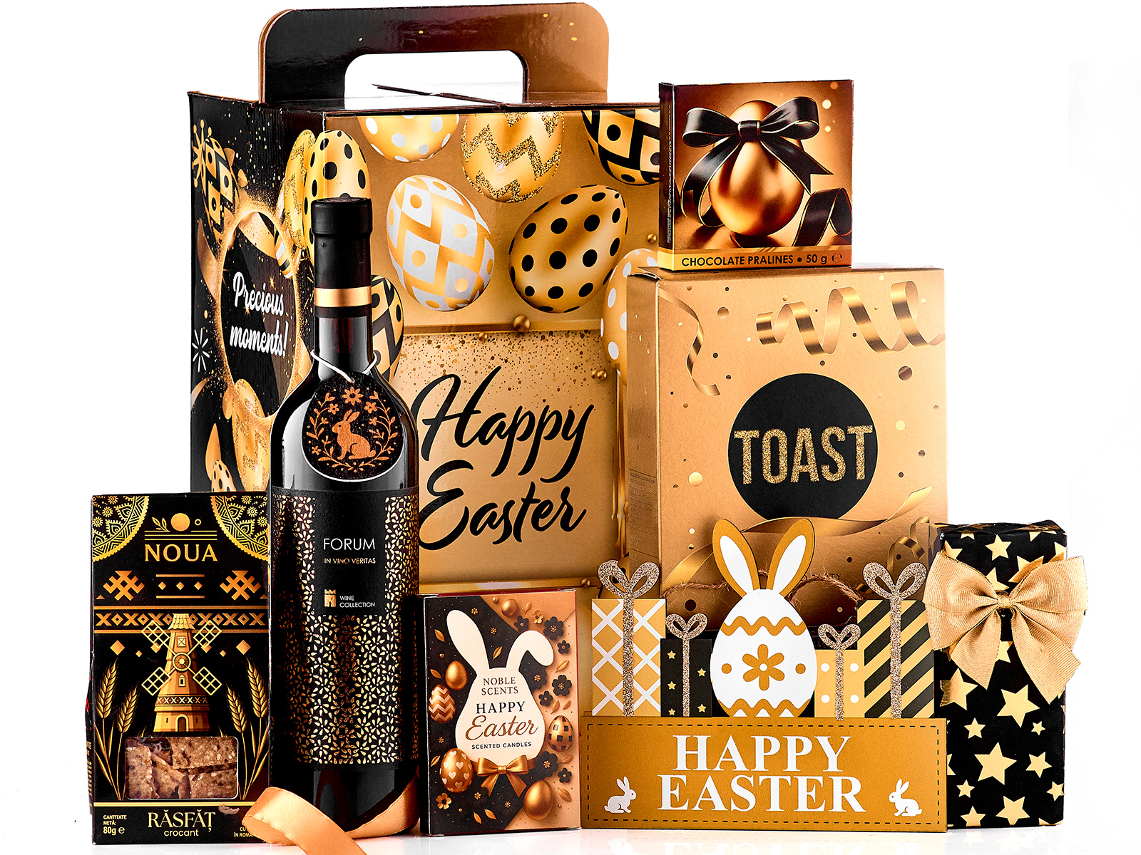 Vin rosu Forum In Vino Veritas Wine Collection 750 ml Salty Party Toast Time to Party 100 g Delice Oro Pralines editie de Paste 50 g Praline Black Gift Box Noua Răsfăț crocant cu susan şi condimente 80 g Set lumanari parfumate Paste Fericit Decoratiune de lemn aurie cu mesaj Happy Easter Decoratiune de Paste Ou din lemn festiv Cutie cadou cu maner cu design festiv Cutie suplimentara pentru protectie si transport
