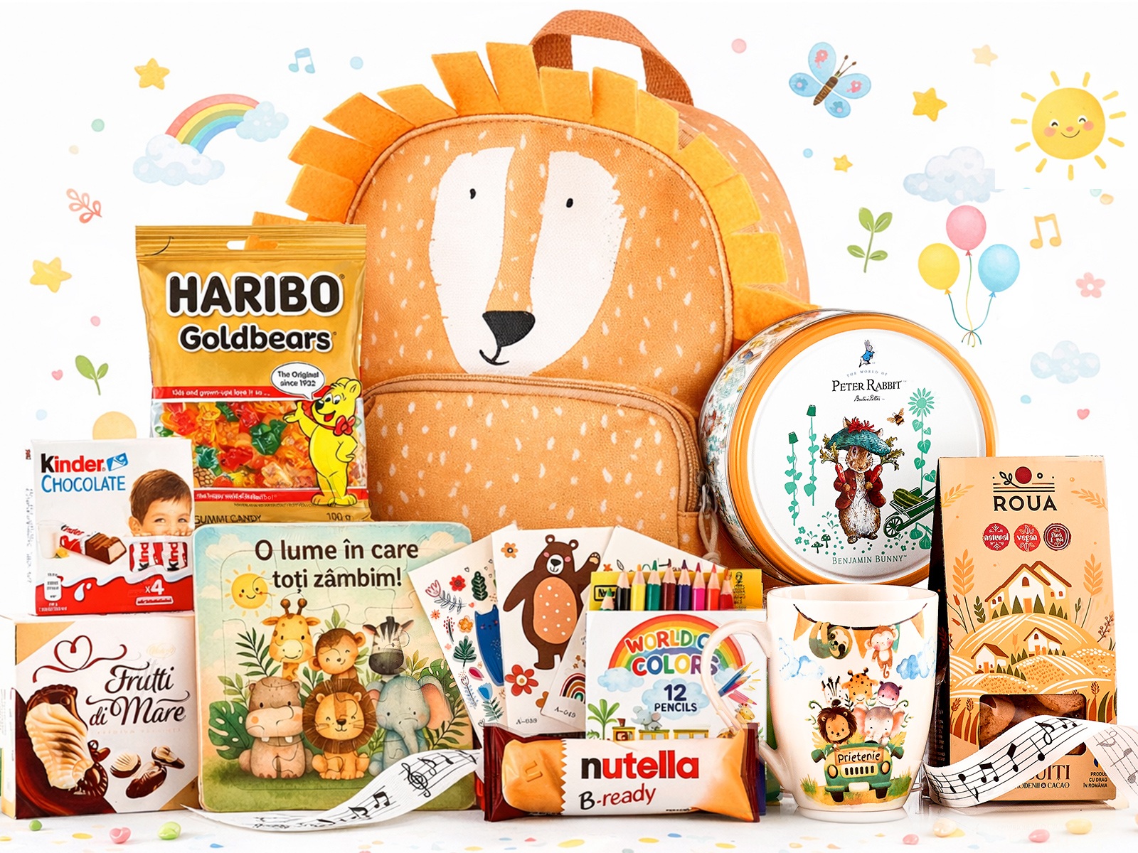 Fursecuri cu unt în cutie metalica embosata 150g Roua delicii dulci cu mirodenii si cacao 80 g Cana vesela Bucurie & Prietenie Haribo ursuleti gumati 100 g Tablete Kinder Chocolate Baton Nuttela si napolitana crocanta Set creioane colorate pentru copii Set Stickere cu imagini diverse Praline ciocolata Seashells 60 g Puzzle copii cu tematica all year Rucsac pentru copii Leut