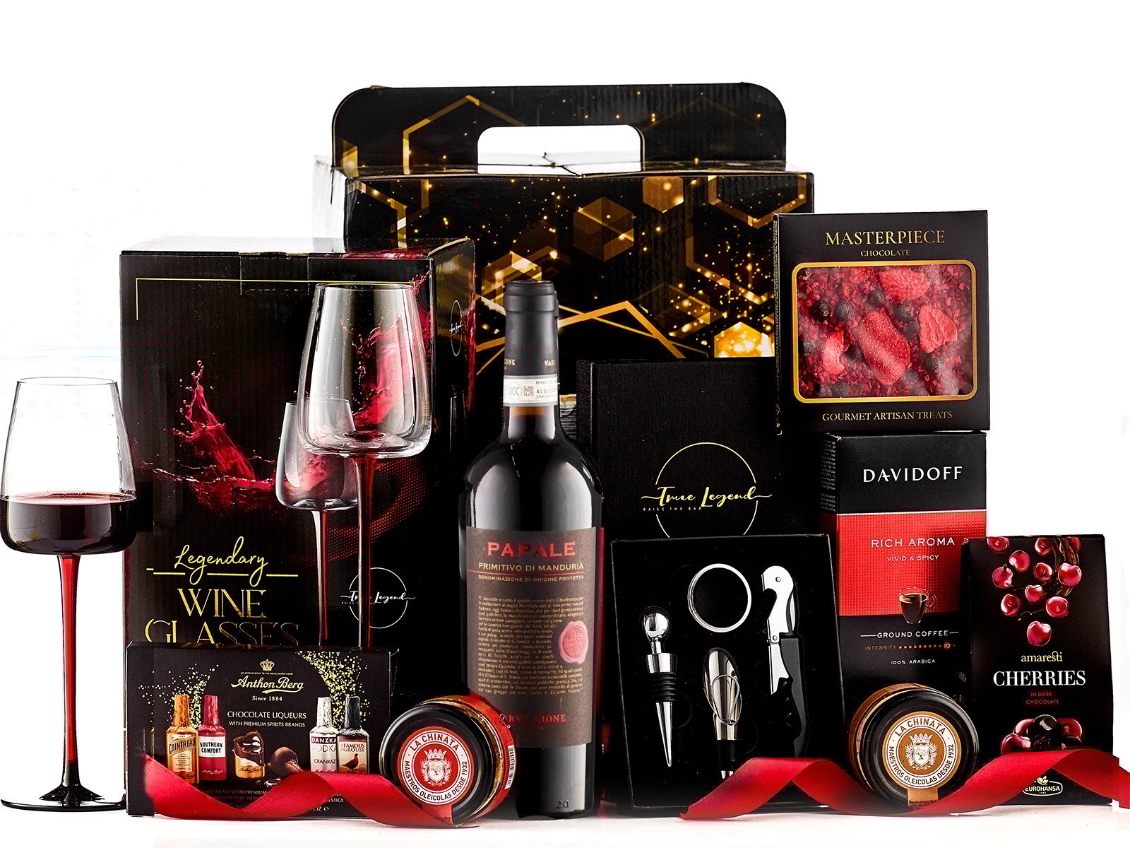 Set 2 pahare de cristal pentru vin roșu, lucrate manual Legendary Glasses Cafea Davidoff Rich Aroma 250 g Cherries in ciocolata belgiana catifelata, intens aromata 80 g Sticlute din ciocolata cu lichioruri fine, Anthon Berg 62g Ciocolata Artizanala Masterpiece Gourmet Artisan cu bucati de capsuni, coacaze si zmeura Terina gourmet de fazan cu trufe, La Chinata Terina gourmet Iberico, La Chinata True Legend Accesorii de Vin, Gift Box in cutie eleganta Cutie cadou cu model elegant Cutie suplimentara pentru protectie si transport