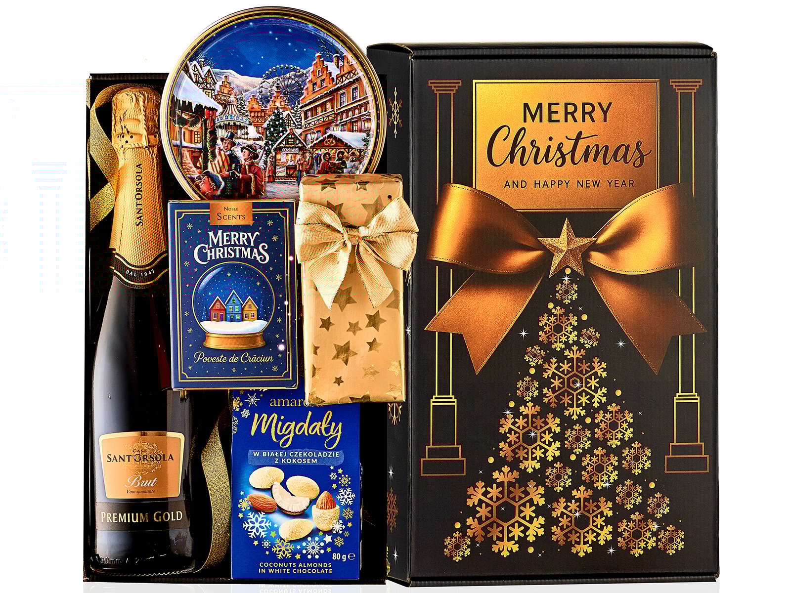 Spumant Casa Santorsola Premium Gold Brut 750 ml Migdale invelite in ciocolata alba 80g Fursecuri daneze cu unt cutie metalica cu peisaj embosat Set lumanari parfumate Festive Season Bomboane ciocolata Gold Gift Box Cutie cadou eleganta cu design de Craciun Filler pentru decor. Cutie suplimentara pentru protectie si transport