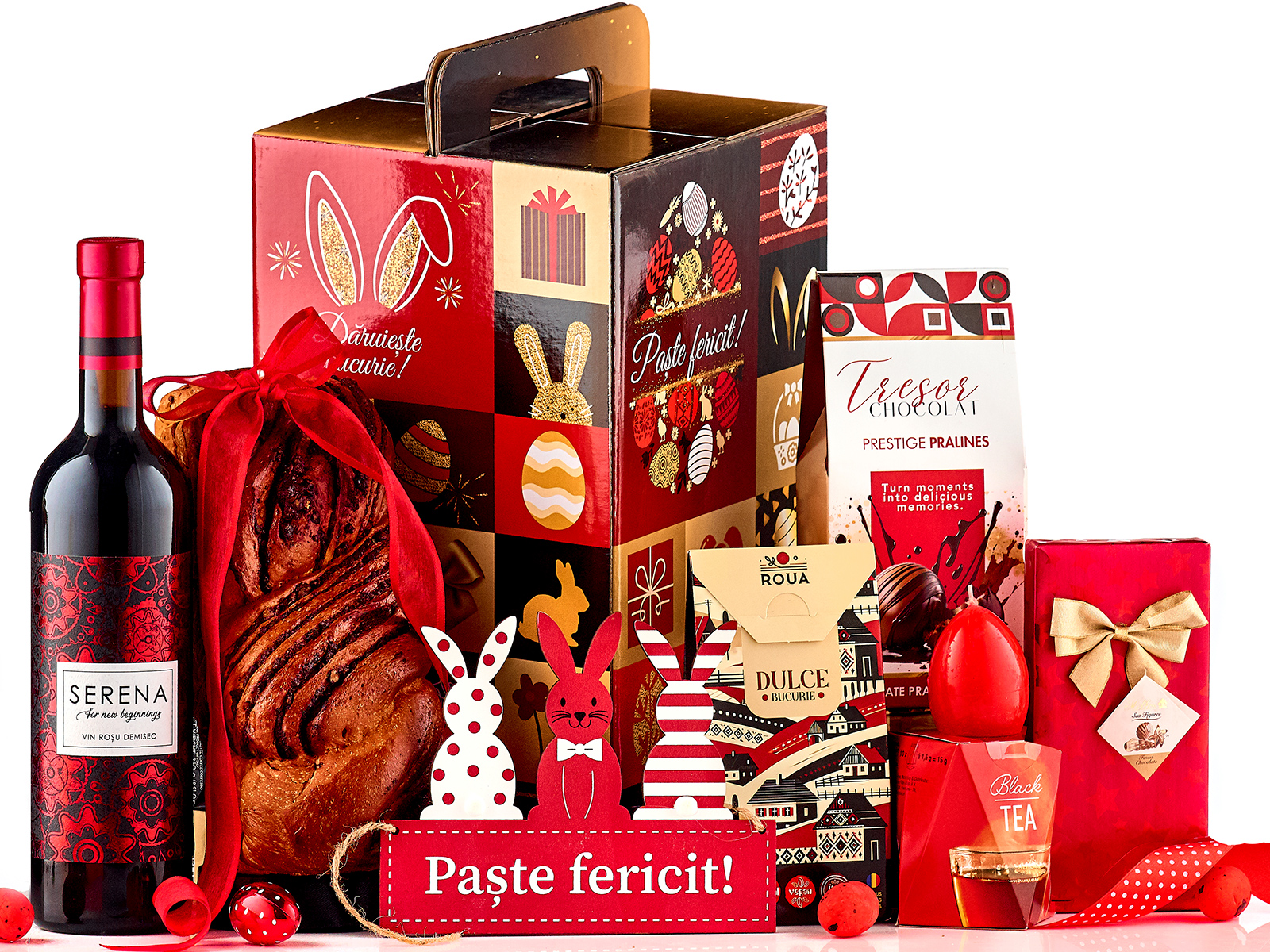 Serena For new beginnings, vin rosu 750 ml Cozonac impletit cu nuca si cacao 400 g Roua biscuiti cu cacao si mirodenii 80 g Praline Prestige Tresor Chocolat 100 g Praline ciocolata Red Gift Box Red label Tea 15 g Lumanare de Paste in forma de ou Decoratiune lemn Iepuras - Paste Fericit! Cutie cadou cu maner cu design festiv Cutie suplimentara pentru protectie si transport