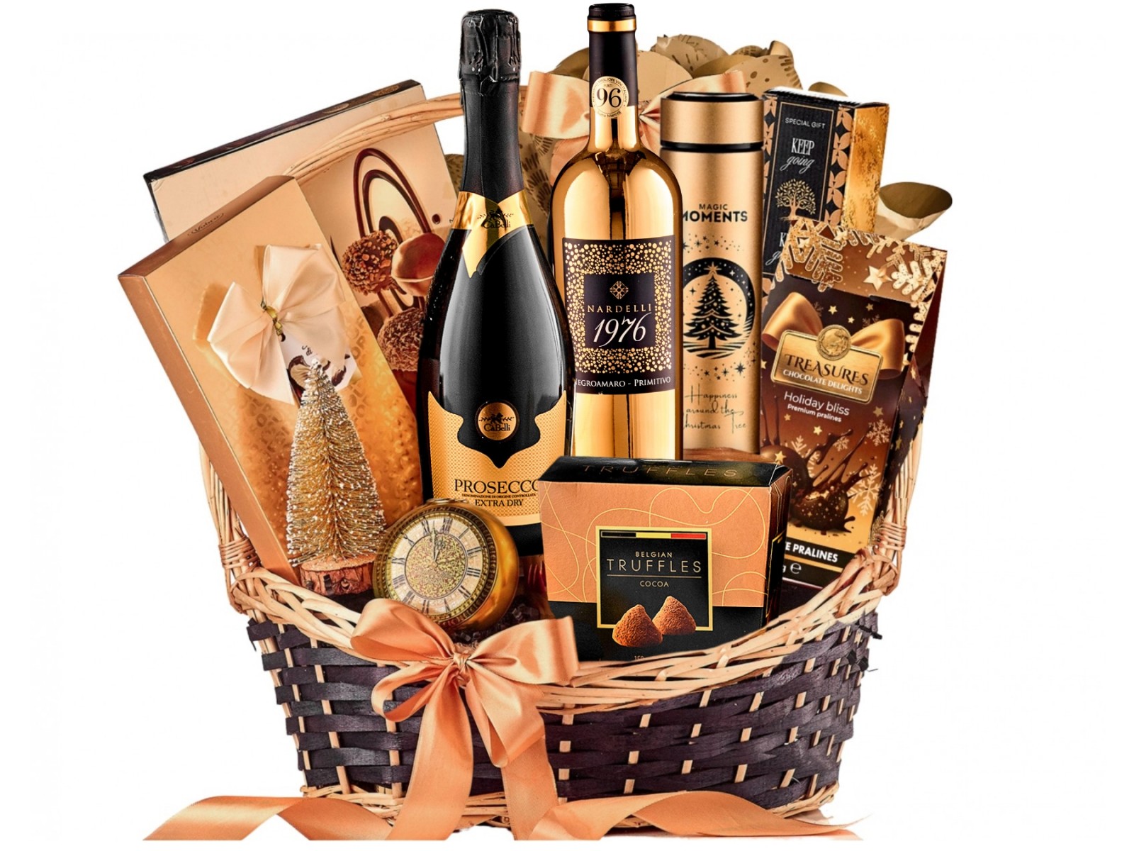 Vin rosu Nardelli 1976 Negroamaro Primitivo, sticla festiva aurie 750 ml Panettone cu stafide si coaja de portocala 500 g ambalat in folie decorativa Belgian Trufe Ciocolata 150 g Bradut decoratiune de Craciun