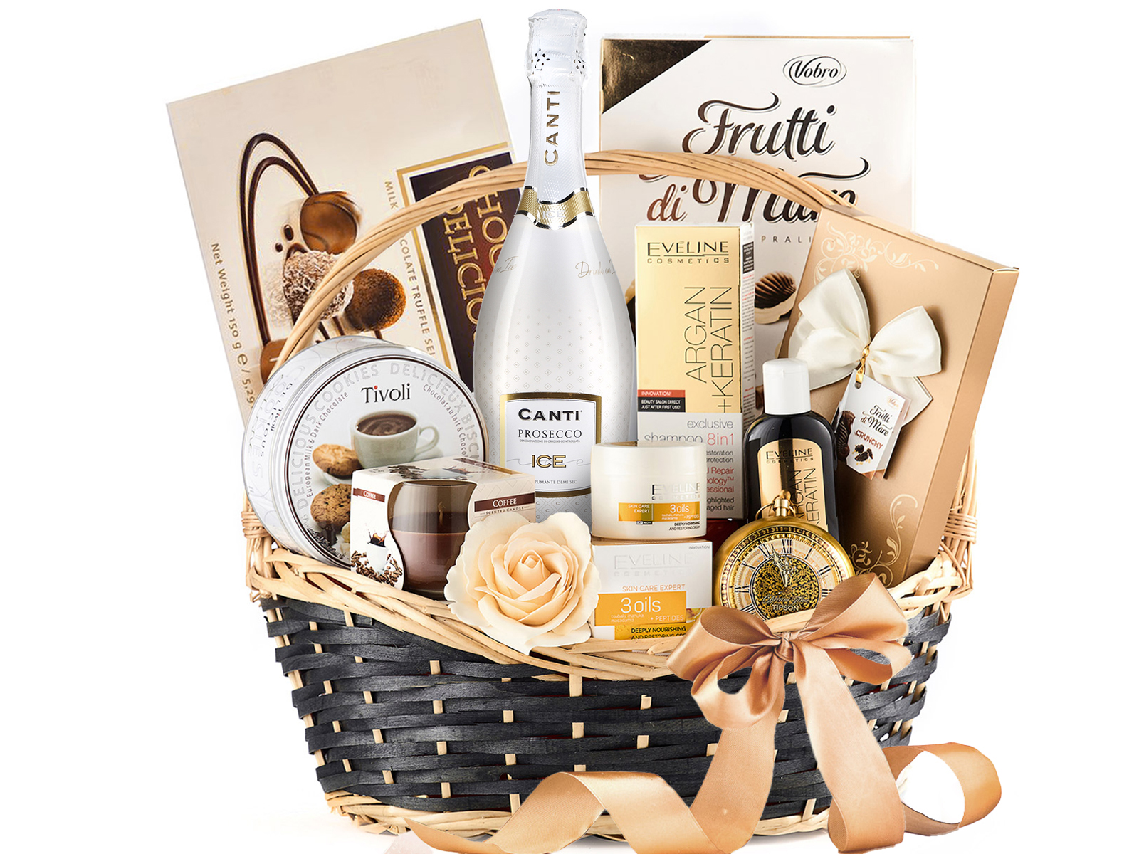 Canti Prosecco Ice Demi Sec DOC 750ml Exclusive Shampoo Argan Keratin Eveline Cosmetics 150ml Crema Skin Care Expert 3 Oils Eveline Cosmetics 50ml Praline Delicious 150 g Fursecuri daneze cu unt si ciocolata in cutie metalica 150g Frutti di Mare Premium Pralines Ceai ceas metalic, Basilur Premium Anniversary Tea Lumanare decorativa in pahar de sticla Praline ciocolata Gift box Crunchy Trandafir parfumat cu petale din sapun Cos cadou elegant Folie de ambalat, decor, funda Cutie suplimentara pentru protectie si transport